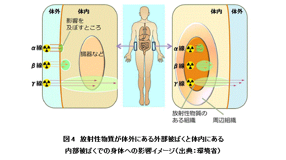 外部からα線により被ばくした場合、体表面の角質層で止まってしまいますので影響はありません。β線は皮膚を透過しますので、線量の高い場合は皮膚が火傷したようになりますが体の深いところまでは到達しません。外部被ばくで問題になるのは主にγ線であり、またγ線を出す放射性物質です。