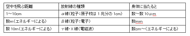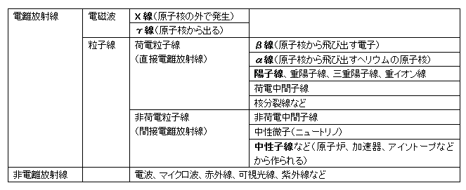 放射線には上表のように電離放射線と非電離放射線があるが、通常「放射線」といった場合は電離放射線を指すことが多い。