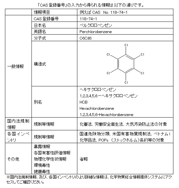 化学物質総合情報提供システムの利用により得られる情報は以下の通りです。