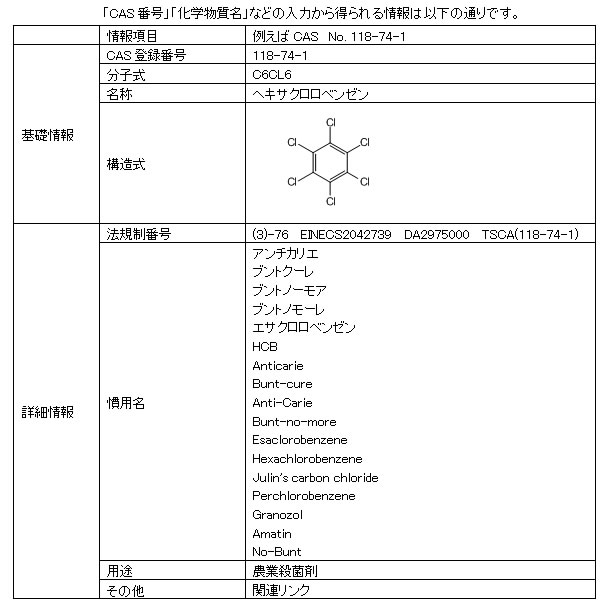 化学情報協会以外でも無料でCAS登録番号の検索は可能なサイトがありますので、以下に紹介します。 ただし、情報量や情報の正確性に問題がある可能性もありますので、複数のサイトを利用するか、または最終的には化学情報協会を利用することをお勧めします。