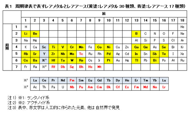 レメタルは一般に下記の表1に示す周期(律)表で黄色に塗り潰した30種類及び後述するレアアース(希土類)17種類との合計47種類の金属を指し、一般的にはレアアースもレアメタルに含まれます。