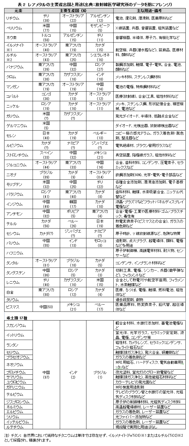 レアメタル、中でもレアアース(希土類金属)が新しいハイテク産業の中に占める重要性がここにきて大きな高まりを見せてきています。しかし表2の主要産出国に示すように産出地域・国が偏在しており、特にレアアース(希土類金属)は何とその97%を中国が占めているという、ある意味で日本の新しいハイテク産業の根幹が非常に危うい基盤の上に成り立っている状況が理解できたかと思われます。 このような状況を考慮し、将来に向けてこれら希少資源のリサイクル技術の開発、効率的な使用済み品の回収・リサイクルルートの確保など、いわゆる都市鉱山の有効利用に向けての種々動きが出てきていますので、次回はその辺について述べたいと思います。 。